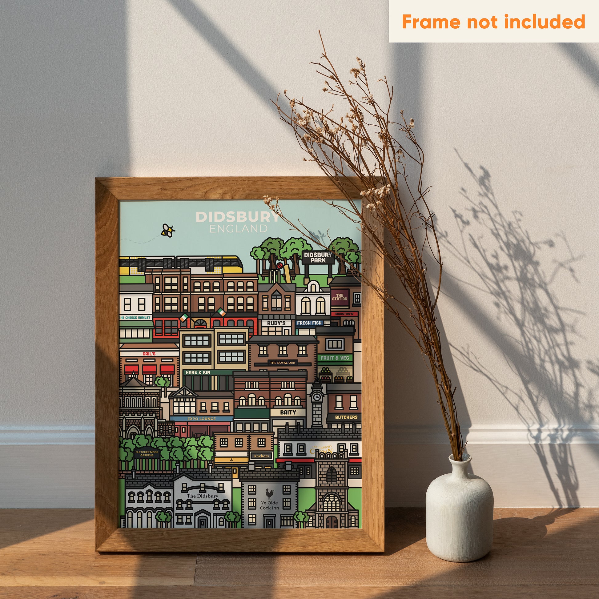 This Didsbury art print is the perfect gift for anyone who loves Didsbury! The vibrant illustration includes landmarks from the city and is a perfect addition to any home or workspace.