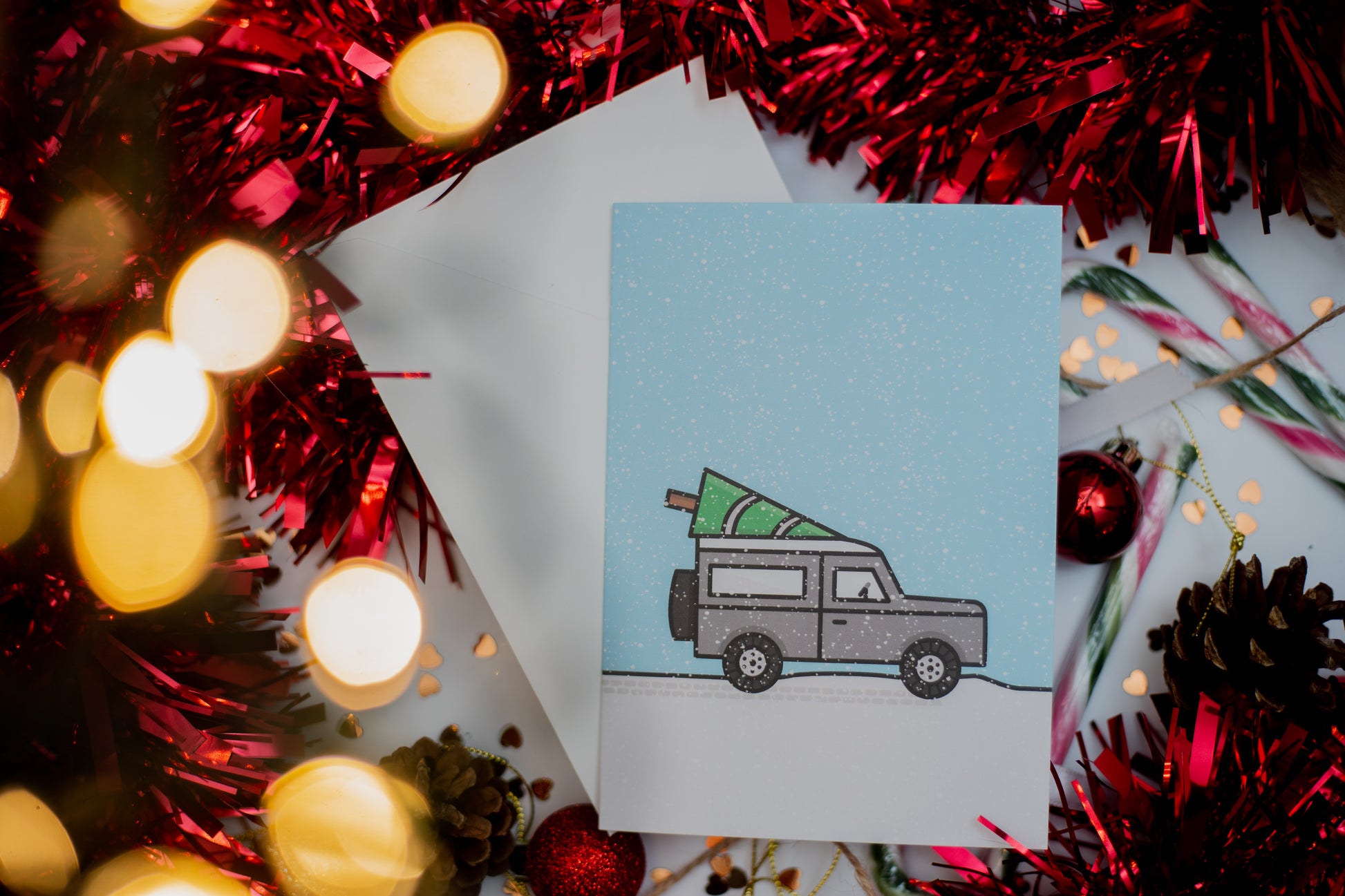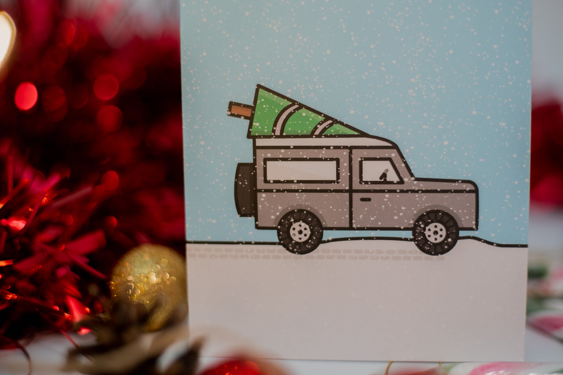 This Christmas card design of a landrover driving in the snow is the perfect greeting card for the holiday season! Send this card to a loved one at Christmas to brighten up their home, or decorate your own home with this illustrated card.