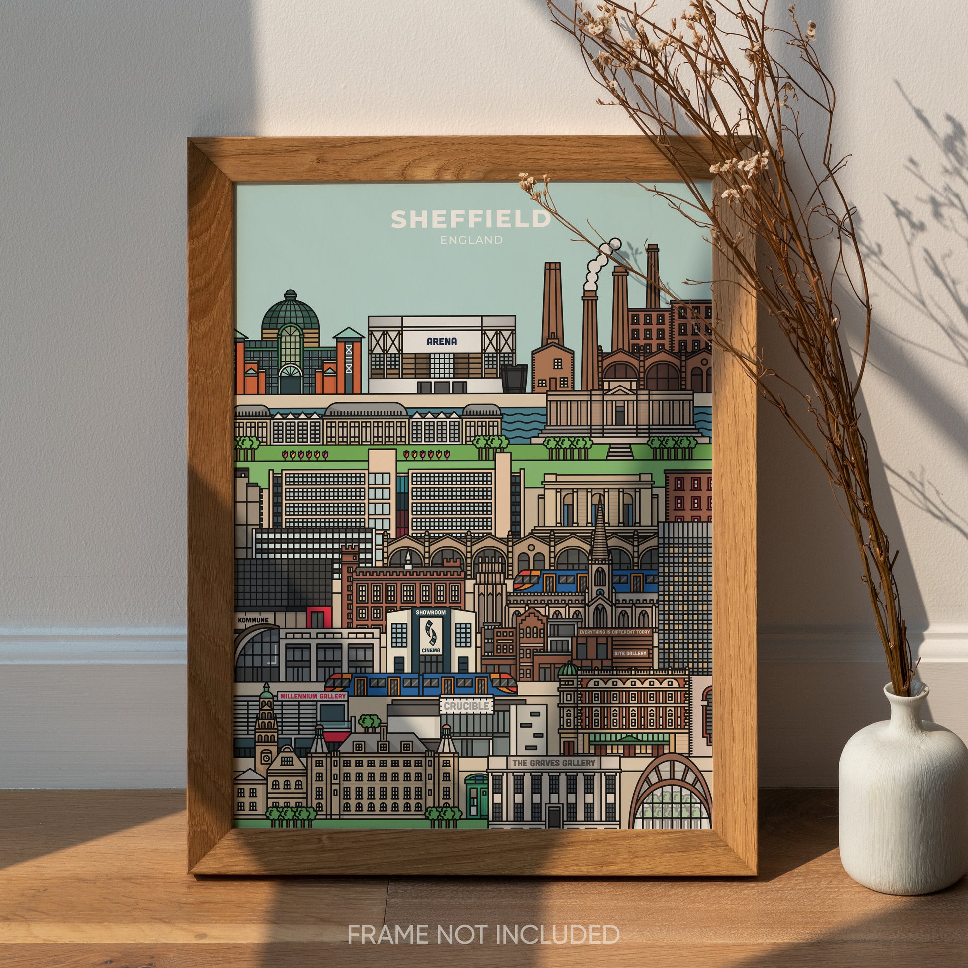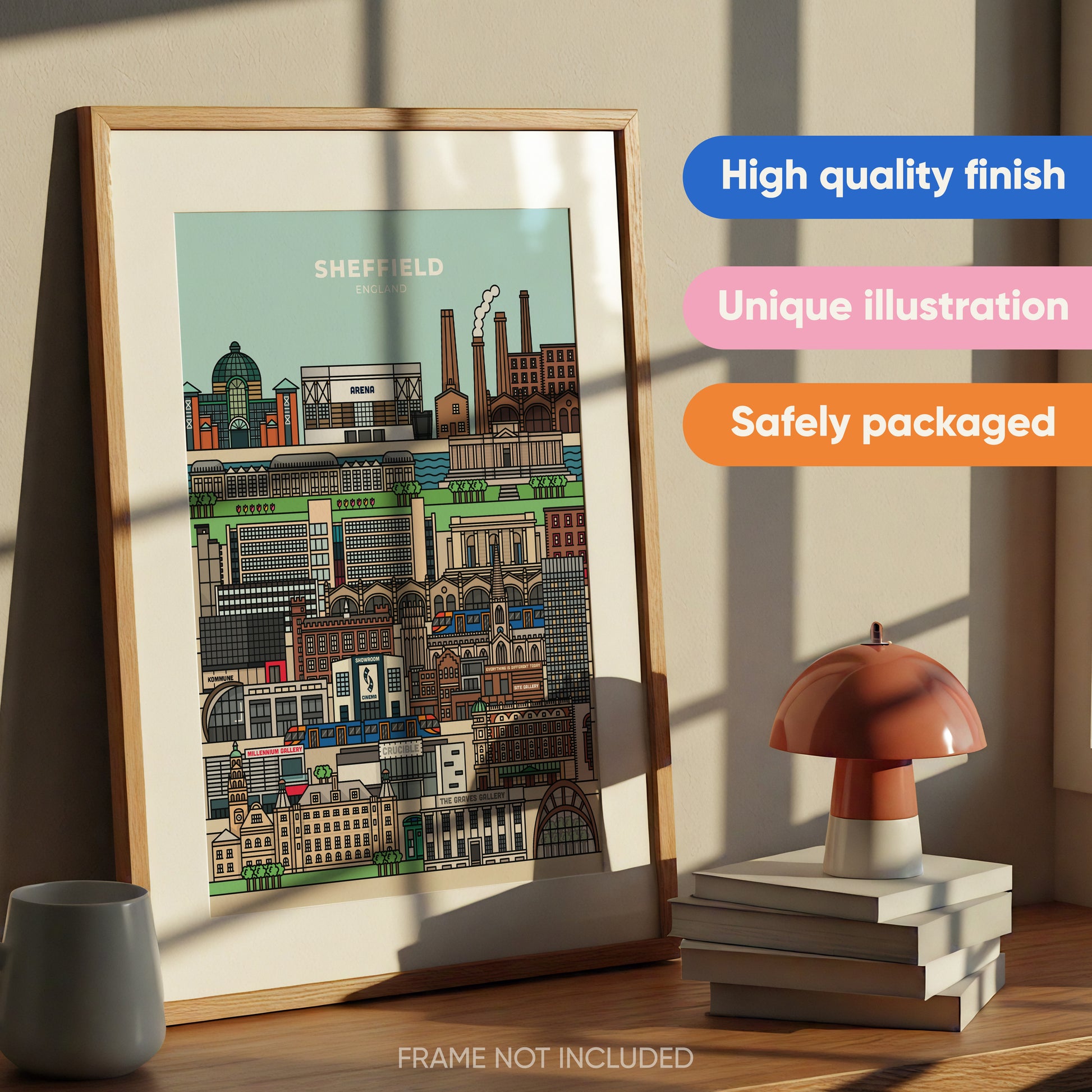This Sheffield-illustrated poster is the perfect gift for anyone who loves the city! The vibrant illustration includes landmarks from Sheffield and is a perfect addition to any home or workspace.