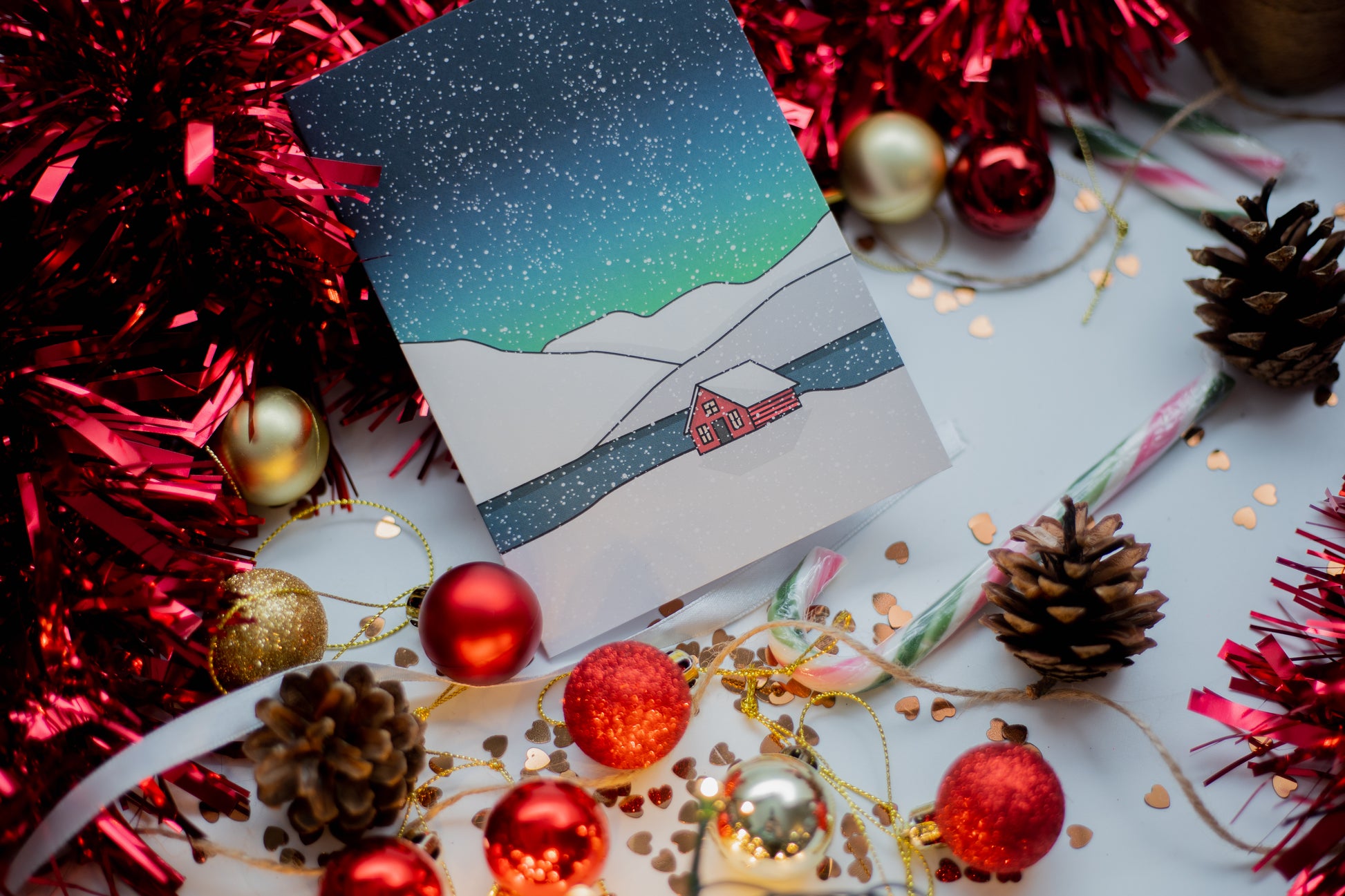 This Christmas card design of a Northern Lights filled Snowy Scene is the perfect greeting card for the holiday season! Send this card to a loved one at Christmas to brighten up their home, or decorate your own home with this Iceland-themed card.